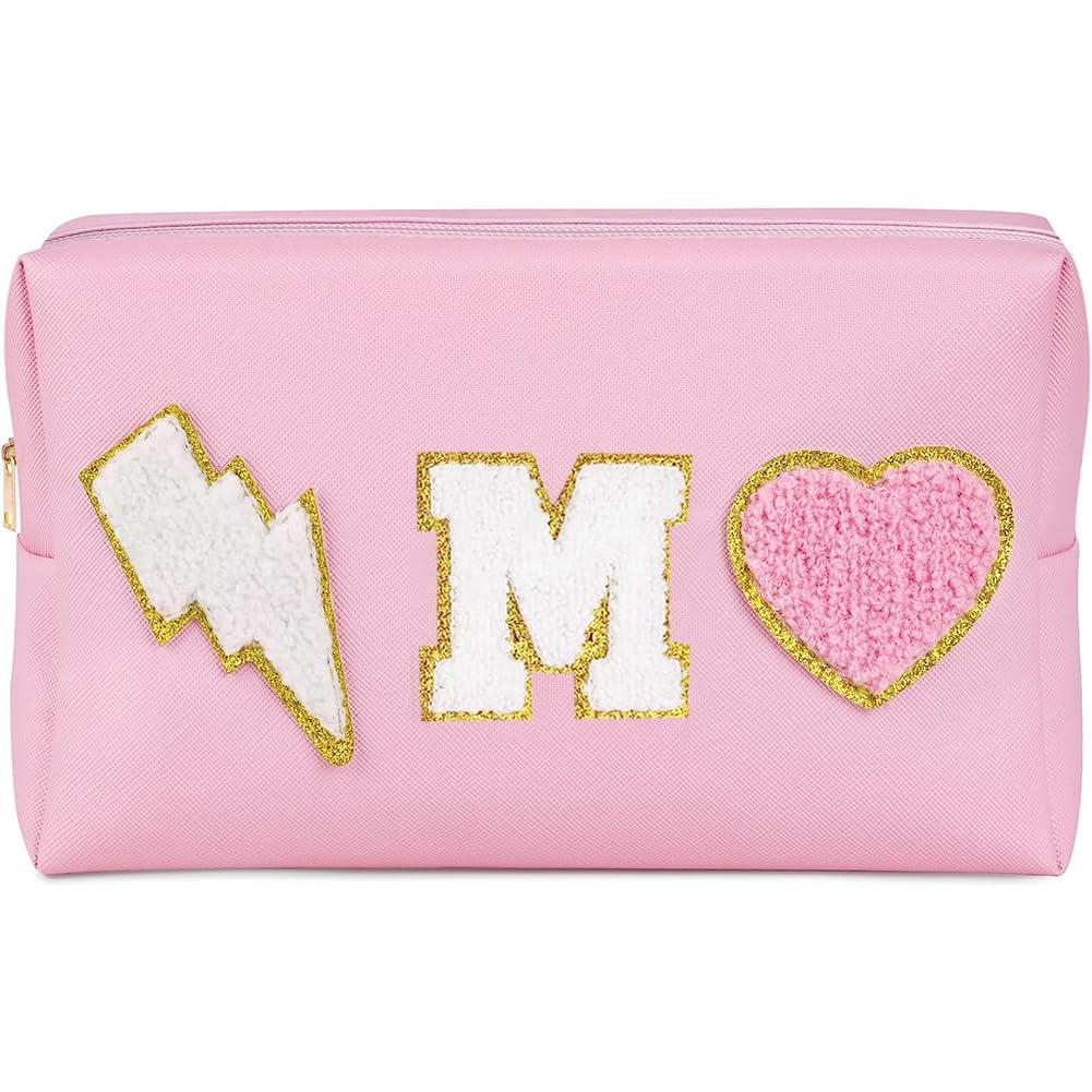 - Exquisite Design- The cute makeup bag is adorned with chenille patches in the shape of letters, lightning bolts, and hearts. The towel embroidery elements, along with the golden shimmering edges, add a fashionable and elegant touch to the bag.