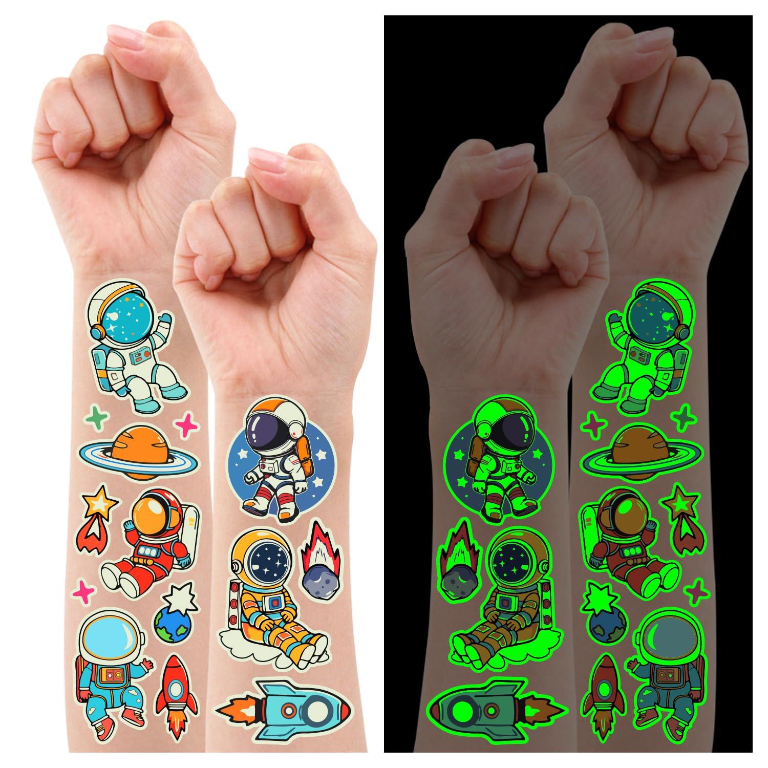- Luminous Space Tattoos will Glow at NightA new space collection of tattoo stickers for kids. Even at a party with lots of friends, these fake tattoos will make you unique and glow in the crowd! A set of glow spaceship tattoos can meet the whole kids party need!
