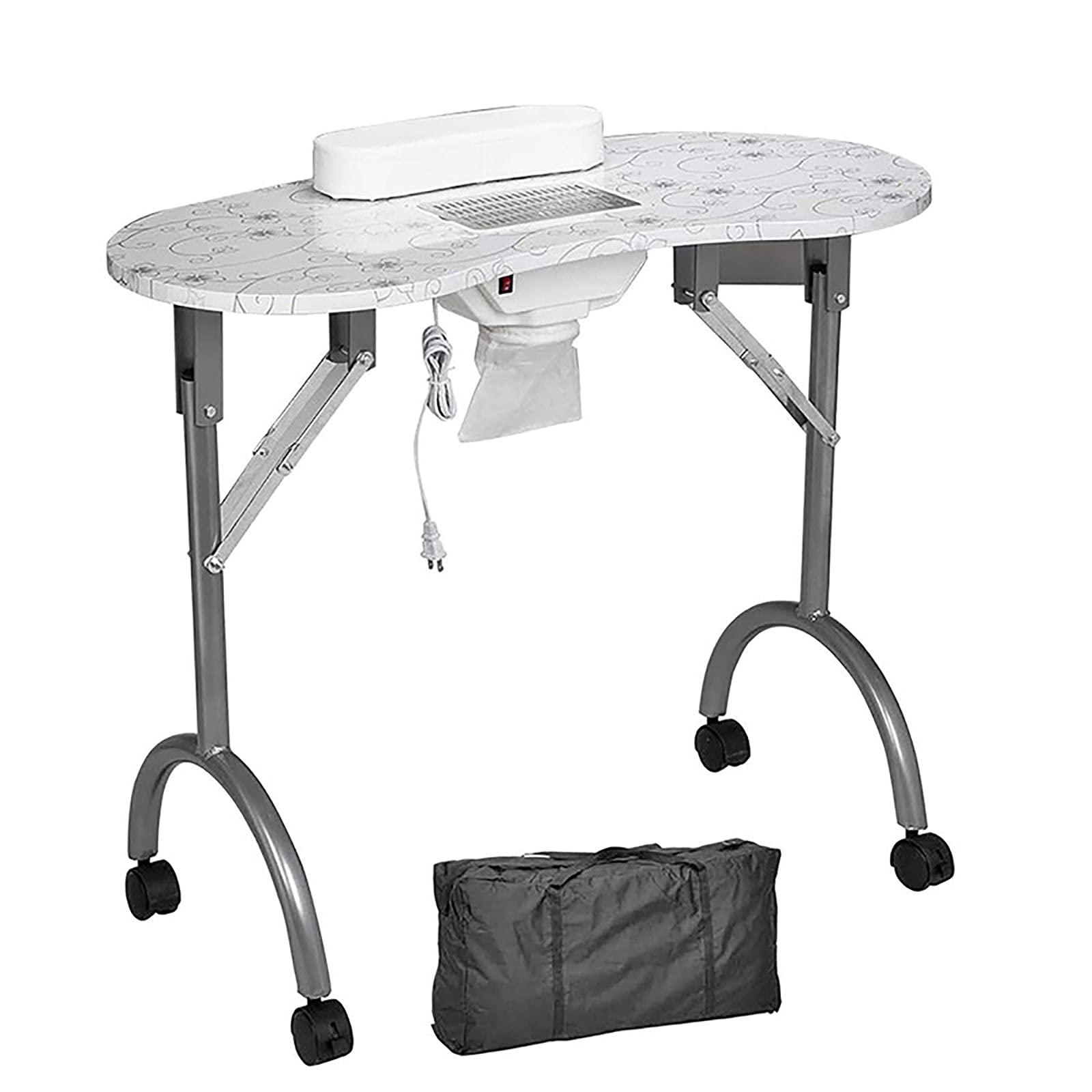• FOLDABLE & PORTABLE DESIGN This manicure table is structured with foldable metal for space-saving and assembling easily. 4 lockable 360rotation wheels make it easier to move around, which helps switch the environment of nail art at any time.