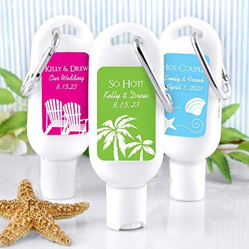 Offer your guests a reason to LOVE sun protection.... Personalized for your special event, perfectly sized for travel and completely convenient with an attached carabiner clip. These first-class favors ensure that your loved ones have no more excuses for not protecting their skin from harmful sun rays. Each eye catching container is filled with a rich yet lightweight SPF 30 sunscreen, infused with natural ingredients.... Organic Aloe Vera, Vitamin E and Sunflower Oil to nourish and soothe sun-exposed skin. Terrific for tropical destination weddings, weekend guest bags, beach barbecues, or any outdoor event!