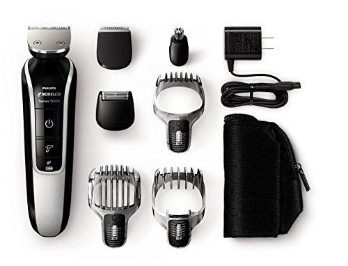 The Philips Norelco Multigroom 5100, All-in-One Trimmer (Model # QG3364) is a turbo-powered grooming kit that provides maximum versatility for the exact style you want. This all-in-one multigroomer has 7 tools for all-in-one face and head styling, including a full-size metal guard trimmer, hair clipping comb, beard comb, stubble comb, mini foil shaver, detail trimmer and nose trimmer. The self-sharpening blades made of finely ground Chromium steel ensure long-lasting performance while skin-friendly rounded blade tips and combs prevent skin irritation. The 18 build-in length settings gives you everything you need to create any head or facial style you want. The turbo boost feature delivers fast results, even on thicker hair. Lithium-ion battery stays charged for up to 60 minutes of trimming after a 1 hour charge. The device is fully washable, simply rinse device under faucet for easy cleaning. Multigroom 5100 comes with a 45 day risk-free trial and a full 2-year warranty. Packaging includes: electric trimmer, full-sized metal guard trimmer, detail trimmer, nose trimmer, mini-foil shaver, hair-clipping comb, beard comb, stubble comb, cleaning brush, power cord, and travel pouch.
