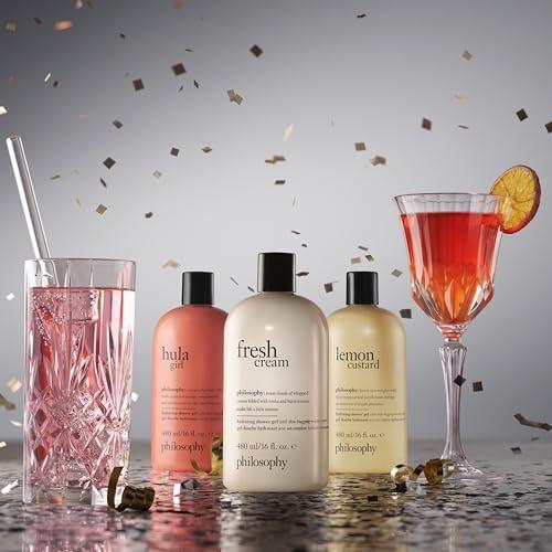 transport yourself to a moment of self-care with the ultra-creamy, iconic philosophy shower gel, upgraded with a skin-hugging moisture complex for intense hydration that wont be rinsed off yet doesnt leave the feel of a film or residue. the moisture-barrier-respecting formula efficiently cleanses, soothes, and comforts dry skin, while a delicate whipped cream, tonka and buttercream scent makes life a little sweeter.
