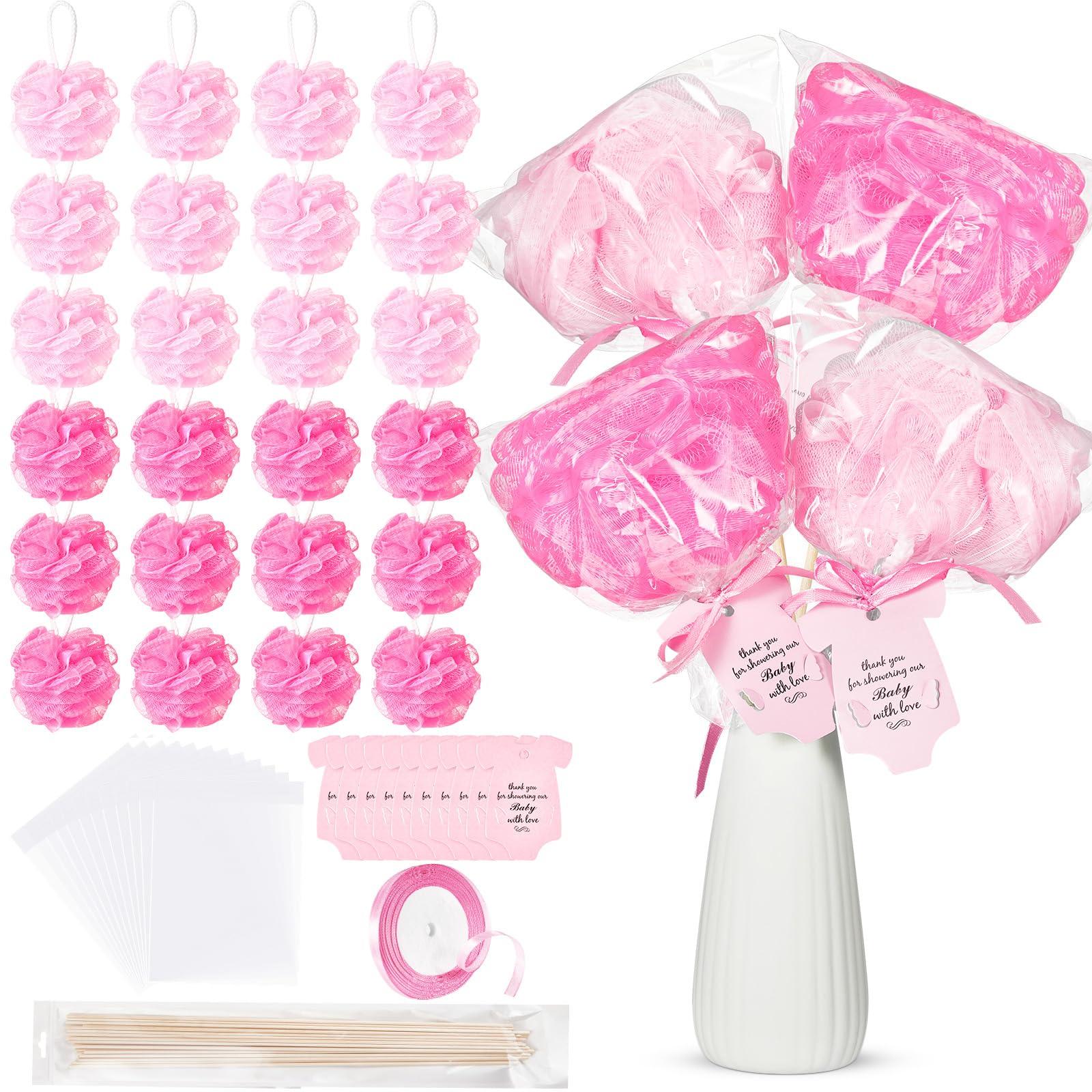 - The Thoughtful Baby Shower Package: this complete set includes everything you need for your baby shower's guest favors, 24 sponge loofahs about 30g in weight, 24 flat pockets, 24 wooden sticks, 24 clothes shape thank you tags, and even a roll of ribbon; It's time saving and caters to your needs