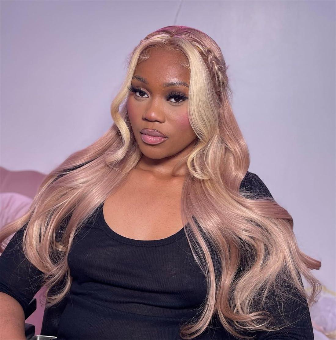 - Pink with Blonde Highlight Lace Front Wig Hair Material100% Brazilian Virgin Human Hair,Absolutely soft, full and glossy!Light Sunset Glow Blonde Color Makes You More Special and Elegant.