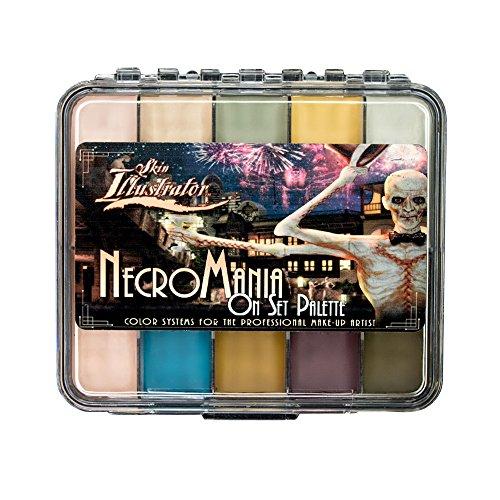 The Skin Illustrator On Set Necromania Palette is a mini version of the classic full size Skin Illustrator Necromania Palette. It has become an industry standard. This compact, pocket size palette contains the full ten colors of the larger Necromania Palette, making touch ups fast and easy. This palette is a must for any makeup FX artist. Use it alone, or in combination with other On Set Palettes. The colors can easily be applied with a brush or mascara wand (palette cells may be too small to apply color with a sponge). Use it alone, or mix the colors with any of the other Skin Illustrator tones to create your own unique blend of color. Also available in Necromania Singles and Liquids and Concentrates for airbrushing and refilling palettes. You must use Skin Illustrator Activator, Skin Illustrator Slow Activator, or 99% alcohol to activate the color pigment. Do Not use 70% alcohol, MEK, acetone, water or any other solvent. Removal is easy with PPI's Telesis Super Solv or Telesis Makeup Remover.