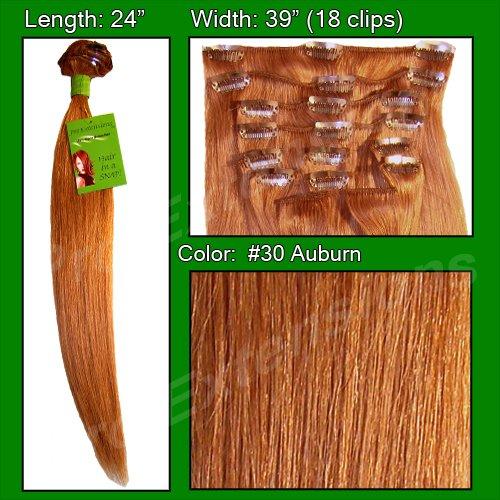 This Pro Extensions clip in hair extension set is Colored #30 Auburn. Pro Extensions are 100% human hair extensions. This set of hair extensions is 24" long and 39" wide. This hair extensions set is Grade A, Color #30 Auburn. The set weight is 115 grams. This set of extensions is straight without any body wave. Pro Extensions can add length, volume or texture to your current hair style. The extensions can be styled effortlessly as easy as your own human hair and will blend seamlessly into your own hair style. The individual weft breakdown within the set is: one (1) 8 inch wide weft with 3 clips, one (1) 7 inch wide weft with 3 clips each, two (2) 6 inch wide wefts with 3 clips each, and six (6) 1 and 1/2 inch wide wefts with 1 clip each, and two (2) 1 and 1/2 inch wide wefts (no clips) for testing/coloring. Each weft has ample clips to ensure a snug hold. Our clips have a polymer coating to ensure no damage to your hair or discomfort to your is the leading provider of premium clip-in human hair extensions in the United States. At last, women can have the hair styles of super stars and super models without spending endless hours of time at high priced hair specialists. Whether you need to add fullness to fine hair, add length to short hair, or to simply add highlights without using chemicals, Pro Extensions is your is the exclusive drop shipper of this product.