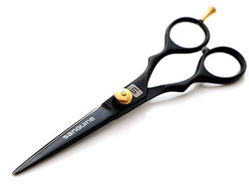 hair cutting scissors, hair scissors, shears for hair cutting. Thse are Professional hair scissors, hairdressing scissors. These Sanguine branded hair scissors have razor sharp blades which actually cut the hair rather snapping them. If the scissors are not sharp enough, they will not only damage the hair but also will lead to long term hair split ends issues. These scissors certainly are as sharp as razor blades which will not only cut the hair with ease but also never cause hair split ends. Very comfortable to work with, light-mid weight scissors with unique deep black colour which is appealing to the eye. Suitable for Professional as well as for personal use. - Buy With Confidence - Try them for yourself and if they do not meet your expectations then we are happy to exchange or refund, no question!