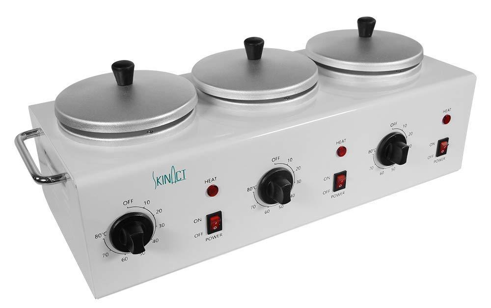 This professional triple wax warmer can heat up to 42oz of wax (3 pots of 14oz). The estheticians in your salon or spa need a steady supply of wax thats been heated to the exact optimal temperature for their client. This professional triple wax warmer prepares three pots at once, even at three different temperatures. Shop with confidence for this professional wax warmer that gets the consistency and temperature of your wax just right, every single time. Features: Electric wax warmer able to heat three pots at once Individual temperature controls Rubber feet prevent slipping Fits three 14oz electric wax pots Adjustable temperature from 10 - 80 degrees celsius Specifications: 17.5"L x 7"W x 4.75"H Weight: 6 lbs Interior Diameter: 3.5 - 4 300 Watt 60 Hz