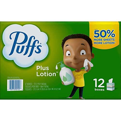 - Pack includes 12 Mega Cubes (72 Tissues per Cube) of Puffs Plus Lotion Facial Tissues