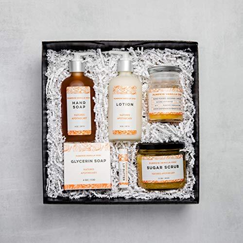 Nothing says \"Fall\" like the comforting smell of pumpkin, warm vanilla, and spicy cardamom. Gift box includes: Pumpkin Vanilla Chai Luxury Lotion Pumpkin Vanilla Chai Liquid Hand Soap Pumpkin Vanilla Chai Hand-Poured Beeswax Candle Pumpkin Vanilla Chai Glycerin Face Soap Pumpkin Vanilla Chai Organic Sugar Scrub Pumpkin Vanilla Chai Lip Balm