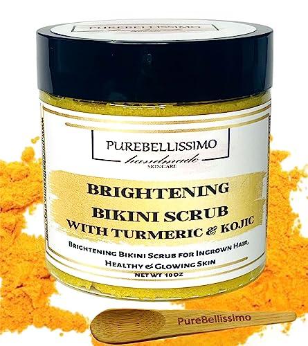 - Fade Away Dark Spots: Do you want to get rid of razor bumps in the bikini area? Our Brightening Bikini Scrub is infused with powerful ingredients such as turmeric and kojic acid, known for their skin brightening properties, to help effectively reduce the appearance of dark spots on your bikini area.