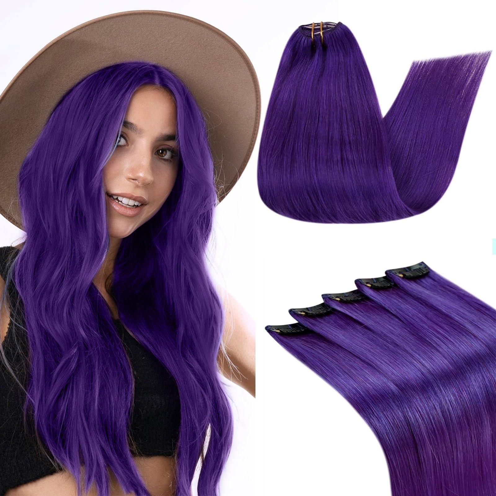 Purple Hair Extensions Bundles: Clip in Hair Extensions Real Human Hair Dark Purple 25g/5pcs and 70g/5pcs 18 Inch Full Head Colored Hair Extensions Purple Clip in Extensions