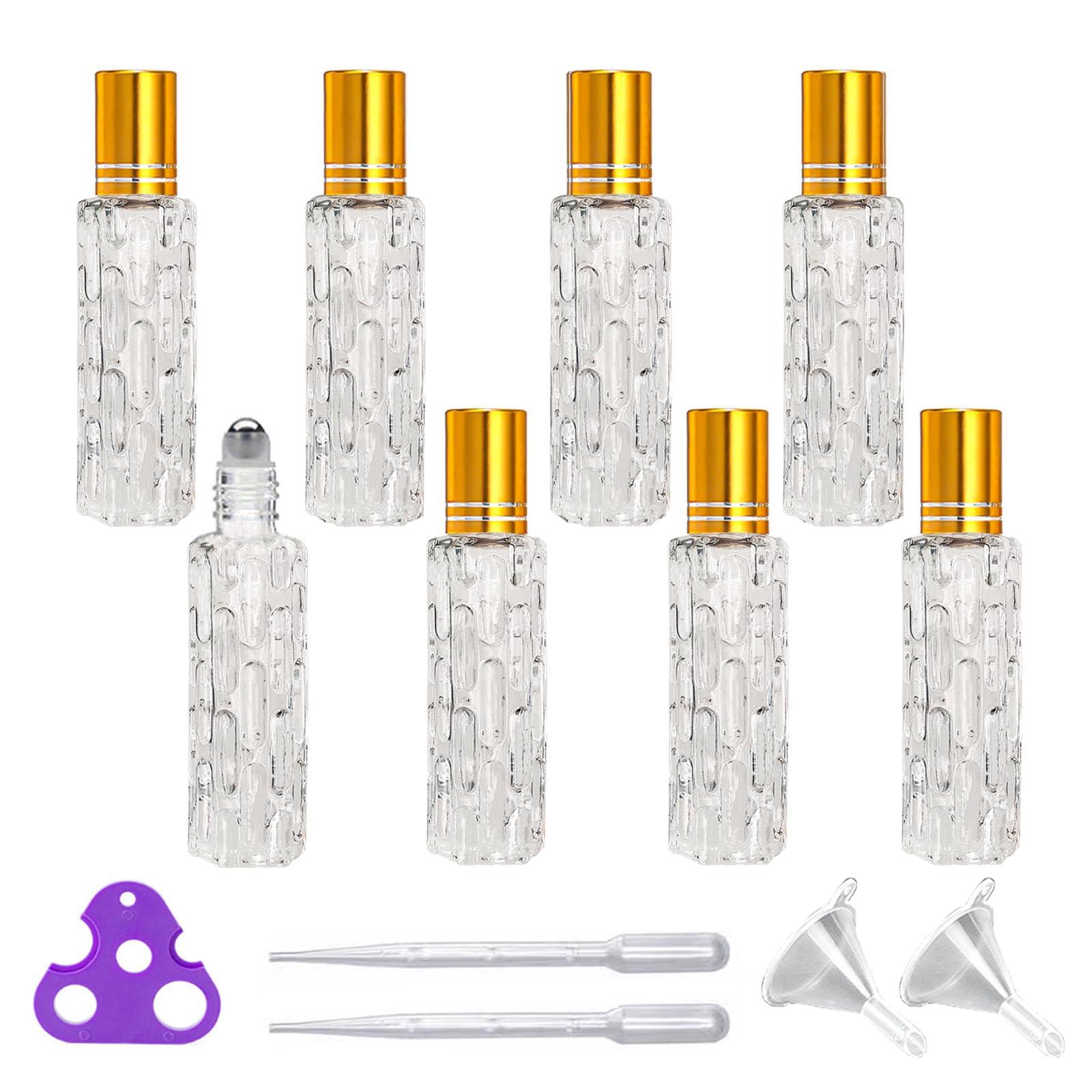 - Package Includes8 Pcs 10ml Roll on Perfume Bottle ,with stainless steel roller balls gold aluminum screw caps ,2 Funnels ,2 Dropper,1 bottle opener