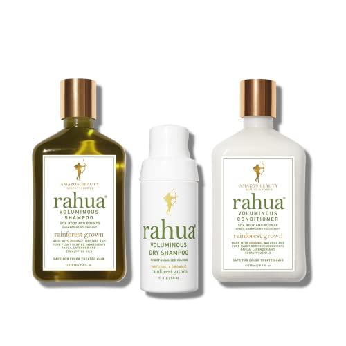 Shampoo - How it Works: Revitalize Shine & Texture, This natural award-winning Voluminous Shampoo strengthens, clarifies, and nourishes hair while delivering noticeable volume and body. Rahua oil, rich in omega-9, fortifies hair from within to help prevent breakage and lavender and eucalyptus extracts offer a calm, uplifting aromatherapy experience. Suggested Use: Apply to wet hair and lather. Rinse and follow with Rahua Voluminous Conditioner. Use regularly for best results. Conditioner - How it Works: Revitalize Shine & Texture, This natural voluminous conditioner leaves hair lustrous, silky, and full of body and bounce. Rahua oil, rich in omega-9, fortifies hair from within to help prevent breakage and lavender and eucalyptus extracts offer a calm, uplifting aromatherapy experience. Suggested Use: After shampooing (or when co-washing) work through hair and scalp, leave in for 3 minutes and rinse. Dry Shampoo - How it Works: Natural powders absorb oil, perspiration, and debris from the scalp and hair and builds a supportive base for long-lasting durable styles. Suggested Use: Twist open the upper cap, shake well, then squeeze bottle to spray evenly through roots and scalp. Work thoroughly into hair to clean, revive, and add lift. Tip: Apply Rahua Voluminous Dry Shampoo at the roots for fullness and to create a foundation. Adds the perfect grip for easy styling.