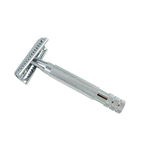 Three piece slant bar razor. Uses standard double-edge razor blades. The benefit of a slant razor is the blade is torqued in two directions increasing the mechanical strength and making the blade more rigid; a thin but rigid blade cuts more efficiently. Head: Chromed Zinc Alloy. Handle: Mirror Polished Stainless Steel 316L bull-dog style, 90 mm length