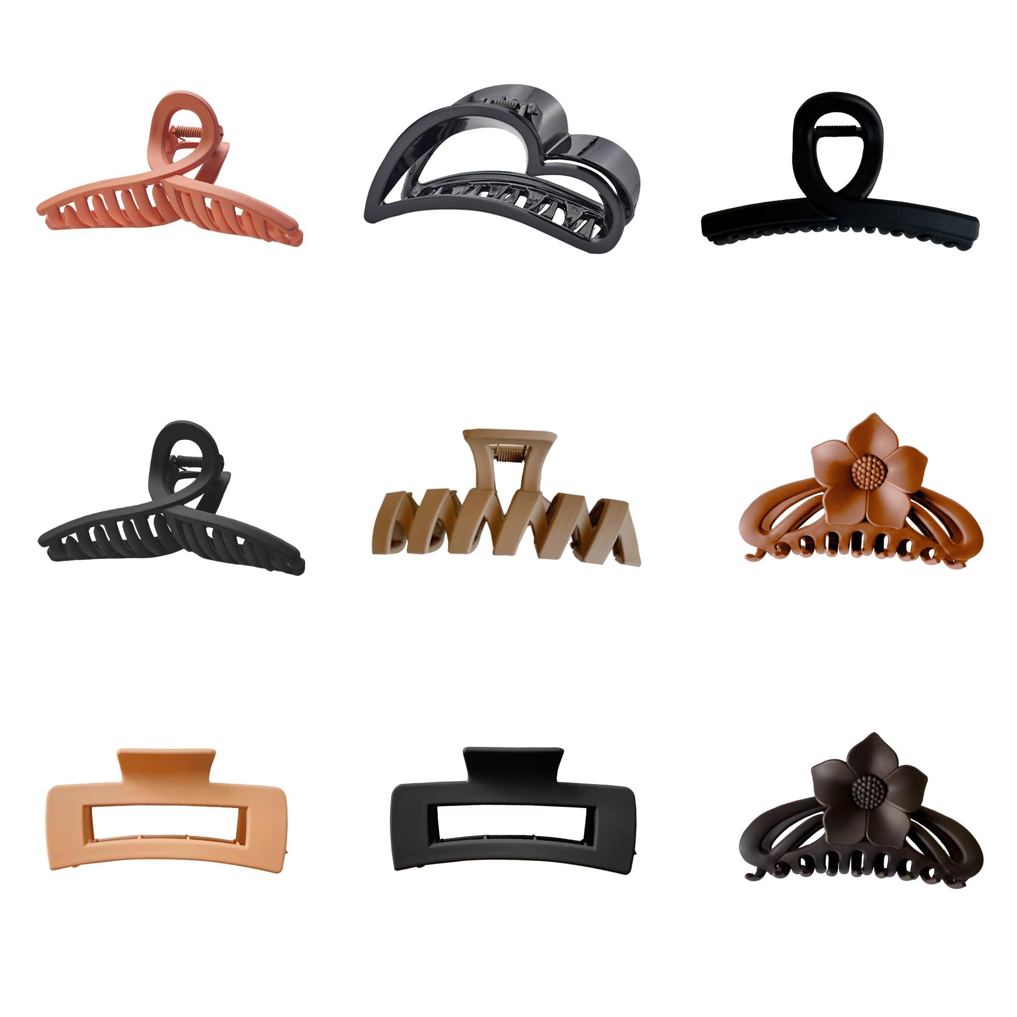 - ASSORTED SET OF 9 CLIPS - This comprehensive set of girls hair clips set includes a variety of hair claw clips and sizes of 3.75 4 4.75 4.5 and 5 in width and 2 2.25 2.5. The hair claw clips for women present an extensive range of hair styling possibilities with their 6 unique styles and 4 captivating colors empower you to experiment with diverse hairstyles, from casual everyday looks to sophisticated updos, giving you endless styling possibilities.