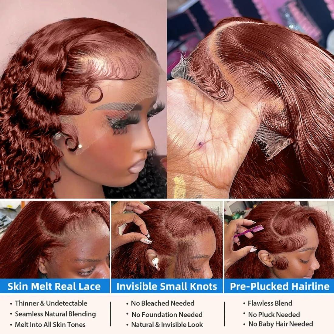 - Reddish Brown Deep Curly Wave Human Hair: Auburn Brown Colored Deep Curly Wave Lace Front Wig Human Hair Pre Plucked Bleached Knots with Baby Hair,Use Transparent Swiss Lace,Melt Down Easily,Can Match Different Skin Colors.