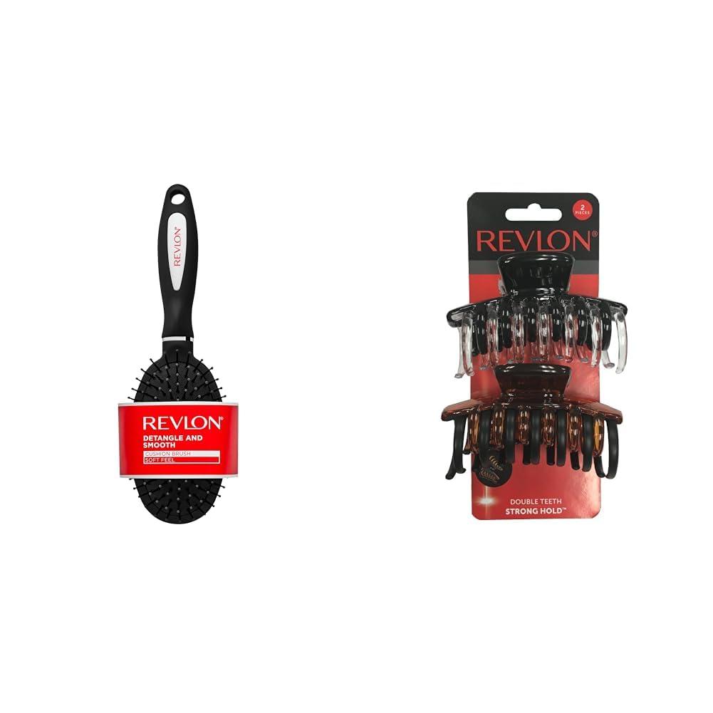 This hair care bundle includes two complementary products to help you style your hair. The first is the Revlon Detangle & Smooth Black Cushion Hair Brush. It has soft bristles and a rubberized finish to gently detangle hair and smooth out curls, working on both wet and dry hair. The second item is the Revlon Strong Hold Hair Claw Clips, a set of two large, functional clips that securely hold your hair in place all day without pulling or damage. They keep hair neat and tidy thanks to double teeth that provide a comfortable yet strong grip, making them great for all hair types and styles. Together these Revlon hair accessories allow you to brush through and organize your hair before securing it neatly out of your face so you can create elegant styles that last. The cushion brush with soft bristles prevents breakage while detangling and smoothing, getting your hair ready for styling. Then the strong claw clips give you a damage-free way to keep your finished look in place from morning to night. With technology engineered to support hair health, this bundle makes it easy to achieve beautiful hairstyles you'll love.