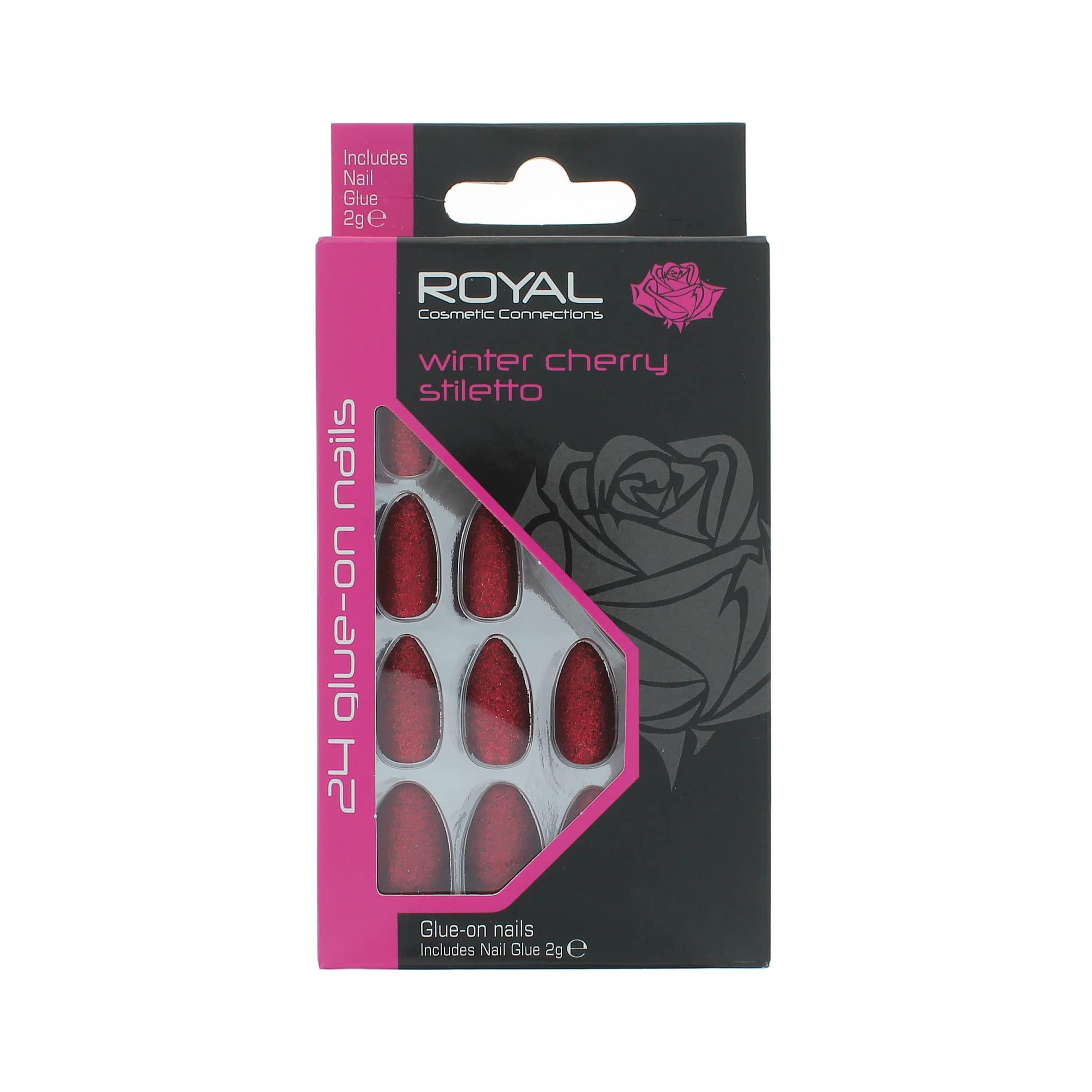 Royal Cosmetics 24 Glue-On Nails - Winter Cherry Stiletto. Add beautiful design to your fingertips to complete your look, these glue on false nails, 24 Royal Nail Tips deliver a unique design for any occasion. royal' s Nail Tip Kit is easy and a simple way to achieve instant Standard nails Salon, Give your nails a beautifully groomed look with the Royal Cosmetics Nail Tips. Fantastic for Christmas parties, wedding parties and just to impress your friends & loved ones.