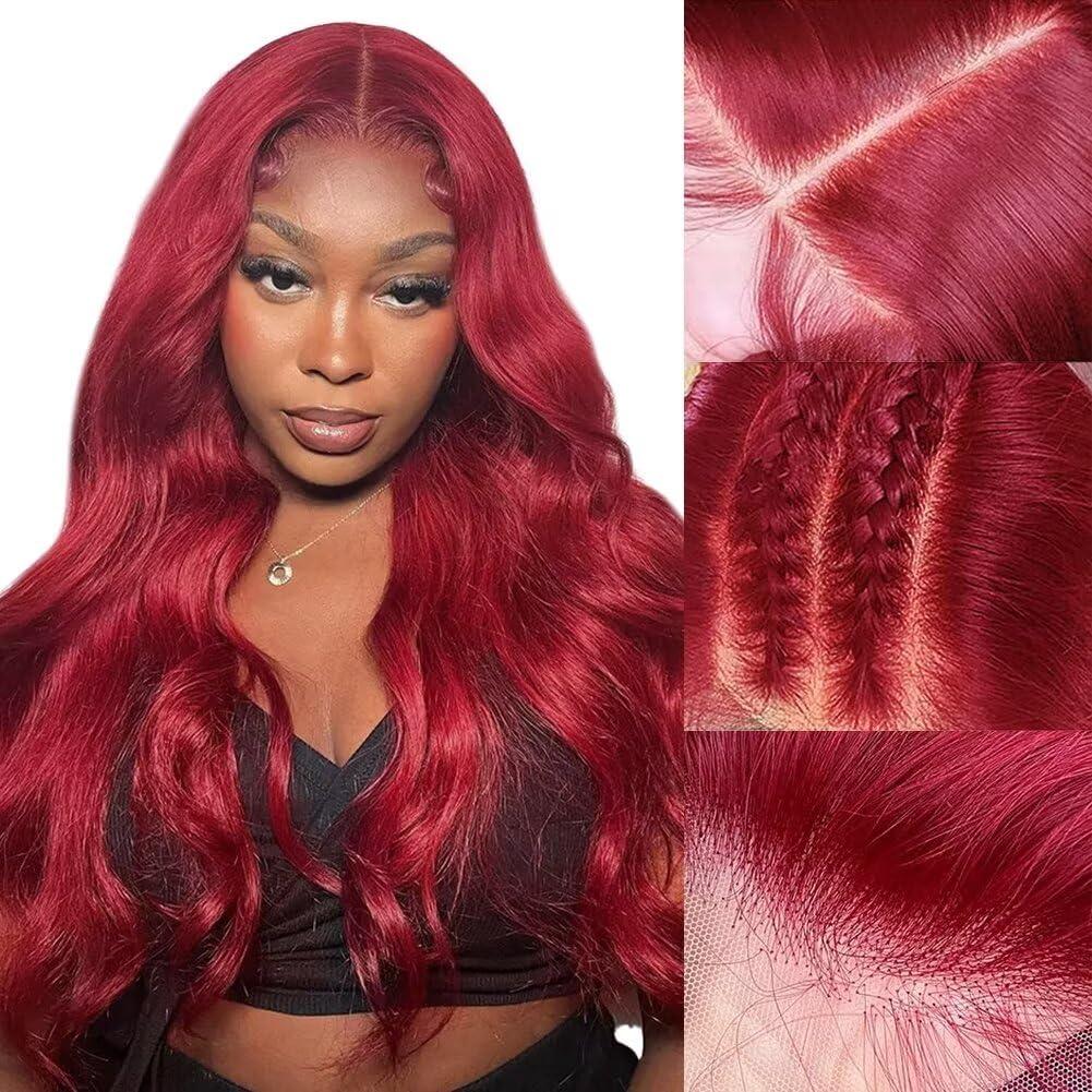 - 99J 13x4 HD Lace Front Wigs Human Hair MaterialThe burgundy HD transparent lace front wig is made of unprocessed Brazilian virgin hair, healthy and bouncy. Body wavy texture, very soft and smooth, 180% density makes hair look naturally full.
