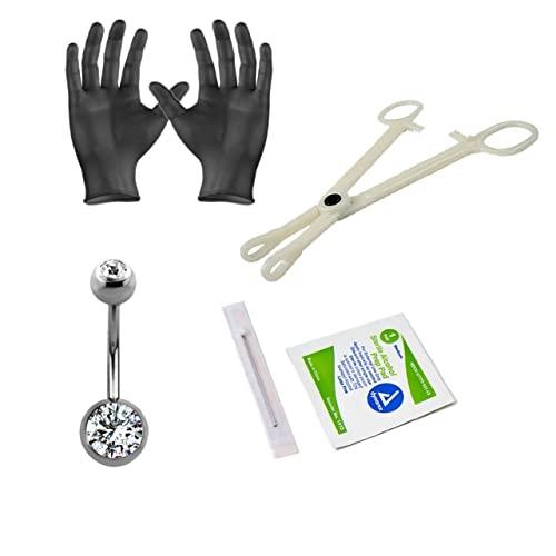 • PIERCING TOOL KIT: PIERCING TOOL KIT: 1PC Forcep clamp tool; 2pcs-a-lcohol pad; 1pc 13G Piercing Needle, 1 Pair of gloves; 1pc 14G Belly Ring. All Items Are 100% Sterilized Using EO Gas.Come in sealed individual pack, new and unused. For disposable use only.