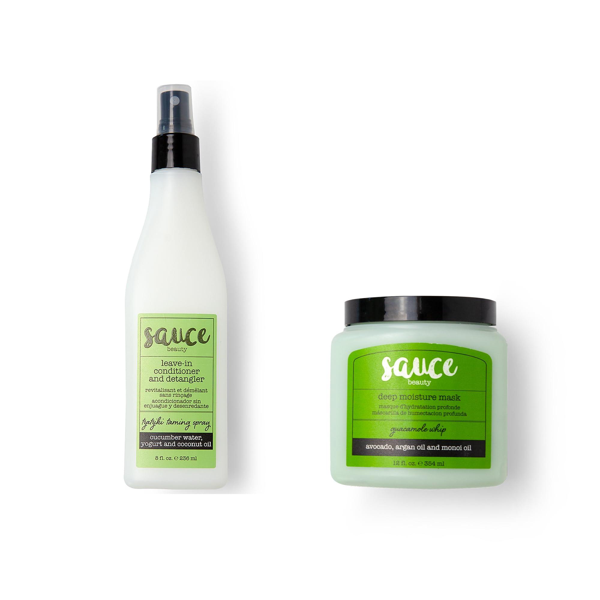 Sauce Beauty Guacamole Hair Mask At Sauce Beauty, we're inspired by how real ingredients can nourish not just your body, but also your hair; Our iconic avocado hair mask includes ingredients like argan oil & honey to focus on hair repair & treatment Take Care of Your Dry, Damaged & Frizzy Hair Say goodbye to frizzy, dry, damaged hair; This hair masks work to prevent breakage, nourish split ends, smooth frizzy hair & serve as a dry scalp treatment; Moisturize your hair without weighing it down Sauce Beauty Tzatziki Spray Detangle with ease with Sauce Beauty's Tzatziki Leave In Conditioner and Detangler Spray; It features a heavenly blend of cucumber water, coconut oil, & yogurt that will make your hair smoother than a freshly-made tzatziki dip Decadent & Refreshing Say goodbye to flyaway hair with our leave in conditioner for curly hair; It is formulated with delectable superfoods that nourish and repair your hair as it controls frizz & wrap it with refreshing scents of cucumber & mint Clean Recipe Our products are made with love so we make sure that they are sulfate-free & paraben-free; We carefully choose nutrient-rich, real-food ingredients that help moisturize, strengthen & hydrate hair for long-lasting softness & shine