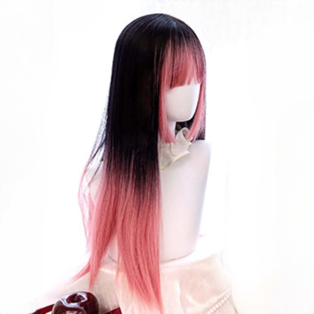 - Wig style: straight bangs, Hime Cut sideburns, long straight hair, gradient and split dyed color showing a naturally layered look. The top color of the wig is mainly black, and the bangs and tail are highlighting color, there are black gradient blue-green wig, silver black gradient wig, Pink and black gradient wig, black and white wig, Red and black wig, Blue and black wig, Purple black wig etc.