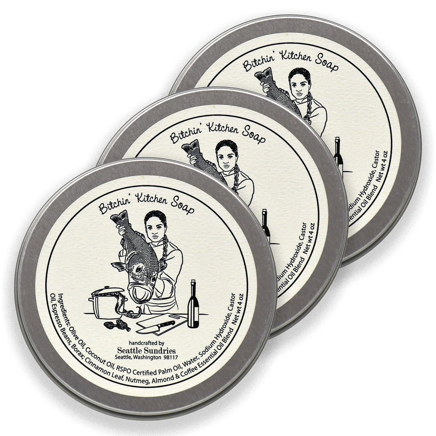 - Bitchin' Kitchen Solid Dish Soap smells deliciously spicy with cinnamon leaf, nutmeg, almond & coffee essential oil scent blend, and ground espresso & borax for scrubbing cleaning power.