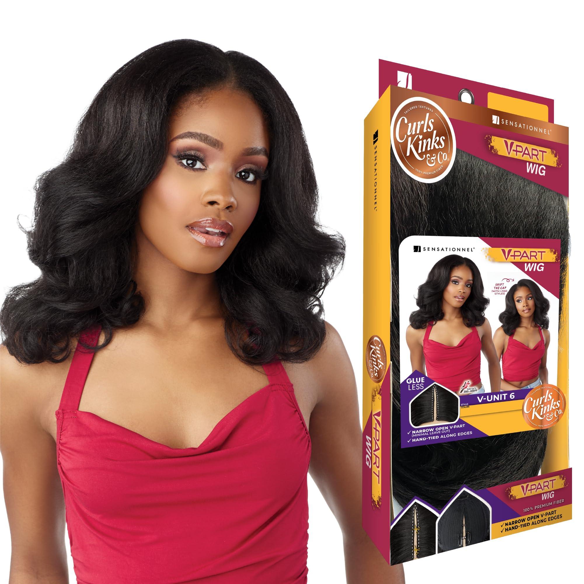 - Brand: Sensationnel Curls Kinks and Co. Glueless Synthetic Hair Narrow open V-Part hand tied along the edges.