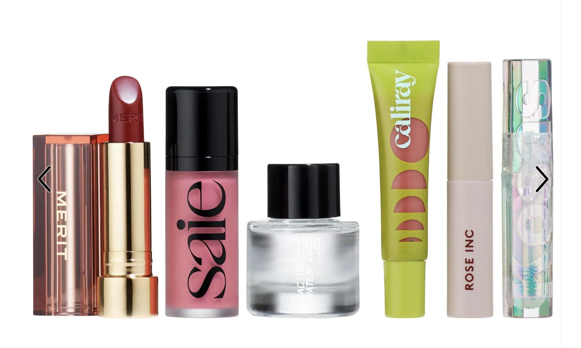 A six-piece set of SEPHORA FAVORITES clean beauty picks including four five -size bestsellers from brands like Saie, MERIT, and Kosas. contains: 0.10 oz/ 3 g MERIT Signature Lip Lightweight Lipstick in L'Avenue (berry brown) (full size) - 0.15 oz/ 4.6 mL ROSE INC Ultra-Black Lash Lifting & Lengthening Serum Mascara in black (mini size) - 0.4 oz/ 12 mL Saie Dew Blush Liquid Cheek Blush in Chilly (a cool toned mauve) (full size) - Freck Beauty Cactus Water Cleansing Lactic Acid Toner (deluxe size) - 0.25 oz/ 7 mL caliray Glazed and Infused No Burn Plumping Lip Gloss in Taco Tuesday (toasted caramel honey) (full size) - 0.13 oz/ 4 g Kosas Air Brow Clear + Clean Lifting Treatment Eyebrow Gel with Lamination Effect in clear (full size)