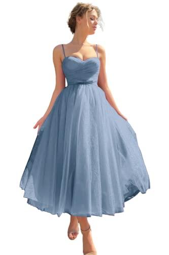 Sevintage Women's Tulle Ball Gowns for Teens Tea Length Princess Dresses Spaghetti Straps Short Prom Dress Midi Party Gown for Wedding Dusty Blue US12