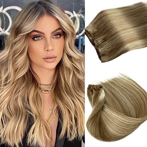 - Double Weft Hair Extensions Real Human Hair Smartinnov Hair sew in blonde hair extensions has always used the double weft process, two wefts sewing together to make the hair sewing more compact,so that the weft hair extensions is not easy to fall off,more durable and lasts longer. Due to this process feature, there will be small short hairs at the root of the hair weft. Please understand that it is normal.