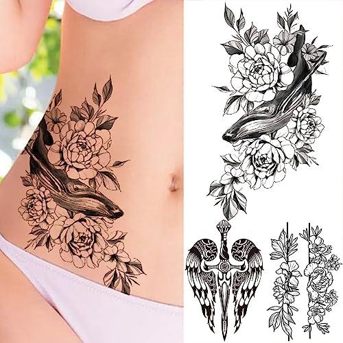 TTHUONG THATHU Sexy Waist Shark Whale Peony Flower Temporary Tattoo For Women Adult Black Wings Dahlia Flora Tattoo Sticker Tatoo