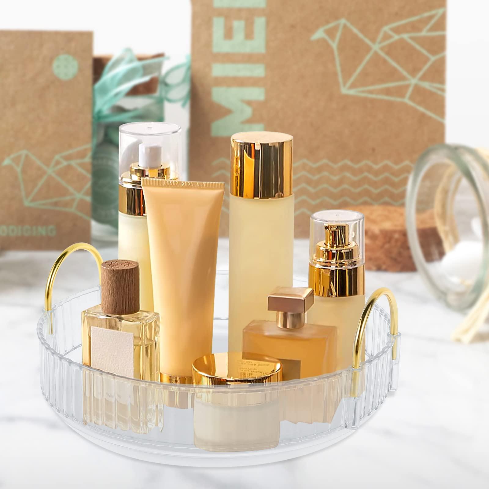 - [Premium Material and Metal Holder] The rotating makeup organizer is made of premium ABS material, which is thickened, strong and durable, not easy to break and deform. Also, the rotating makeup organizer features metal holders on both sides. White transparent color combined with gold metal holders that is delicate and upscale.
