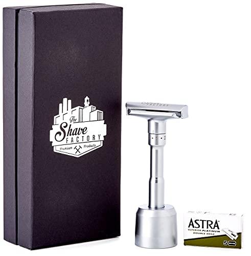 Shaving Factory adjustable safety razor plus stand and 5 Astra Platinum razor blades Perfectly finished with variable height ,where 0. 5 is the minimum level of agressivity and 6 is the maximum. Sold in elegant packaging , it contains the own Base Stand (1,4cm is the diameter of the hole for the handles and deep 2cm) This safety razor is sold with 5 Astra platinum razor blades.