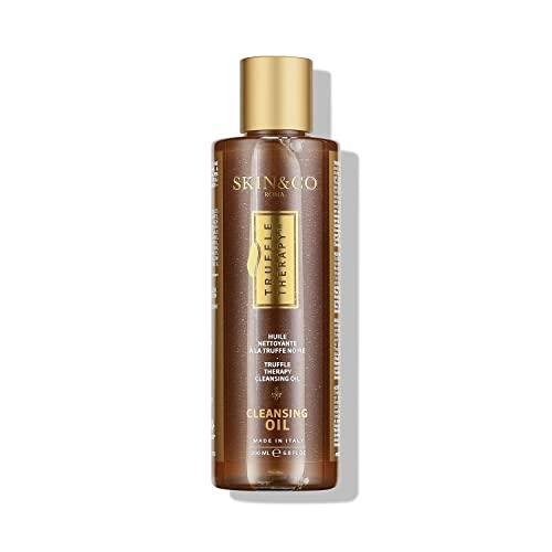 The truffle therapy cleansing oil is a biphasic formula featuring 20 percent of skin and co s proprietary truffle extract. Free from parabens, phthalates and mineral oils, this exclusive cleansing oil is strong enough to remove waterproof makeup, while delicately cleansing the skin. Additional skin soothing ingredients that can be found in our deep cleansing formula are sweet almond oil, organic Argan oil and rose extracts.