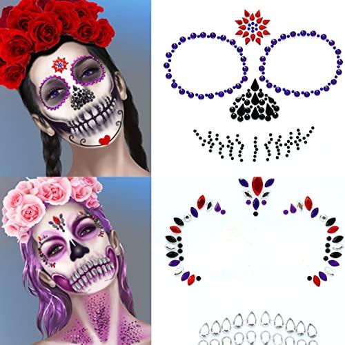 Jacnkb Skull Face Gems Jewels Rhinestone, Halloween Temporary Face Tattoos, Day of the Dead Face Tattoo Stickers, Crystal Body Gems Stick on Face for Festival Rave Party Cosplay 2Pcs