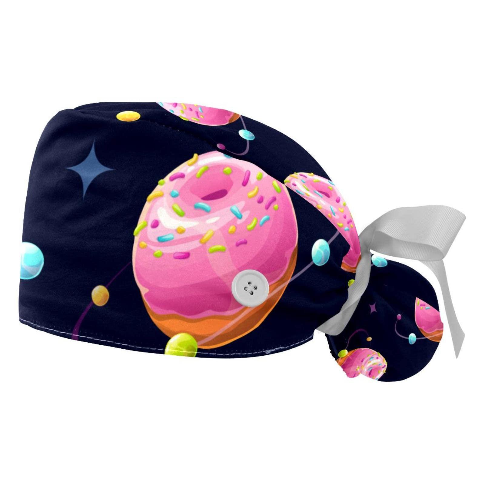 Lyetny Space Donut Planet Universe Scrub Caps Hats Women Bouffant Working Hat Ponytail Holder for Women Long Hair Covers 2PCS