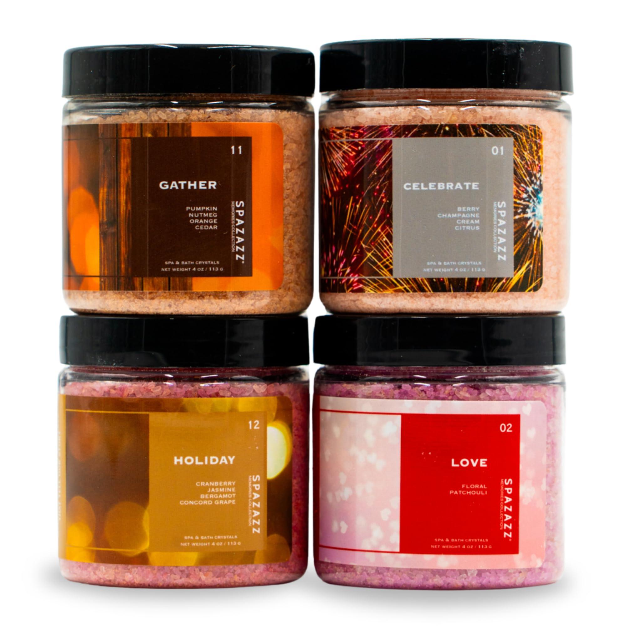 - SPAZAZZ MEMORY COLLECTION BATH SALTS SET: The Spazazz Memories Collection 4-pack includes the scents Love, Holiday, Celebrate, and Gather, each designed to bring back special memories while elevating your spa or bath experience.
