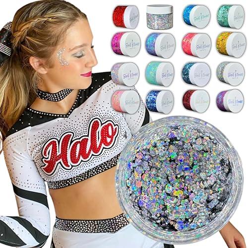 Designed Especially for All Star Cheerleaders, Cheerleader designed, Cheerleader approved. *Chunky Holographic Glitter* Designed to help you SHINE on stage, our highly pigmented, cosmetic grade glitter gel dries and stays in place all day and easily peels off for easy removal. Non toxic, vegan, cruelty free and safe for use on your face and body. It is Light weight, long-lasting and super sparkly. The chunky holographic glitter is more dramatic than regular glitter gels creating an incredibly high shine, light catching sparkle effect that cheerleaders love.