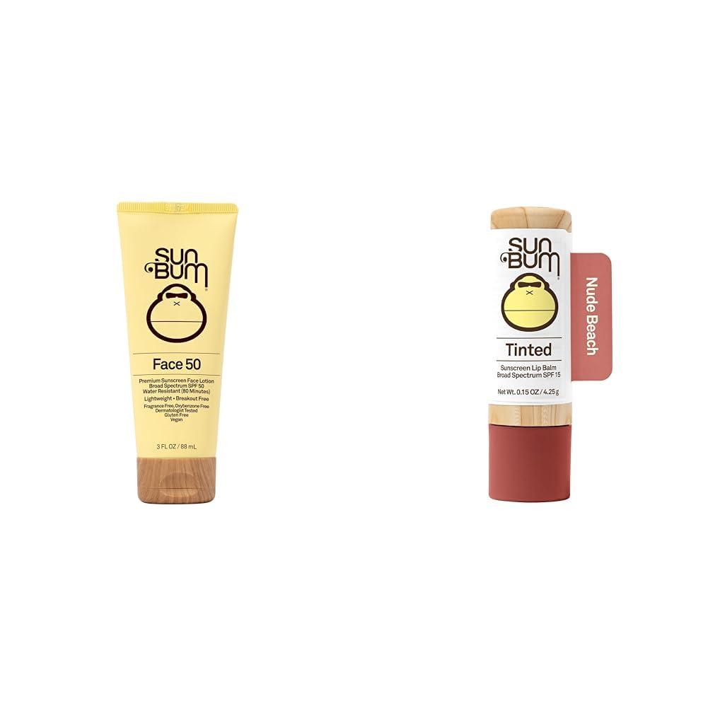 This Sun Bum bundle pairs our popular SPF 50 Original fragrance-free sunscreen face lotion with our nude beach tinted lip balm featuring SPF 15 sun protection. The non-comedogenic facial sunscreen moisturizes skin with Vitamin E while providing water-resistant UVA/UVB coverage for up to 80 minutes, perfect for protecting your face during outdoor activities. It is also Hawaii 104 Reef Act compliant and free of oxybenzone, octinoxate, gluten, parabens, and cruelty. Our tinted lip balm accents your lips with a subtle, natural nude color while hydrating them with coconut oil. It delivers broad spectrum SPF 15 sun protection and is hypoallergenic, paraben-free, silicone-free, oxybenzone-free, and cruelty-free. Both products are made in the USA with skin-friendly ingredients. Whether you're spending long days on the beach, hiking scenic trails, or pursuing other outdoor adventures, this Sun Bum bundle keeps your skin and lips protected with non-greasy sunscreens specially designed for active lifestyles.