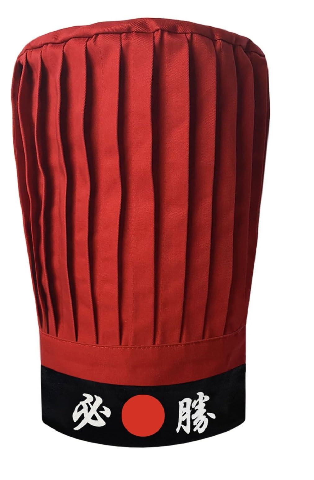 The set include 1 red tall hat and one tie on Japanese tie on headband. Material: poly-cotton blend, soft, breathable, and absorbent. Hibachi chef tall hat: 12" tall in red, a traditional, pleated pattern, lightweight and comfortable, with adjustable fastening strip in the back. One size fits all.