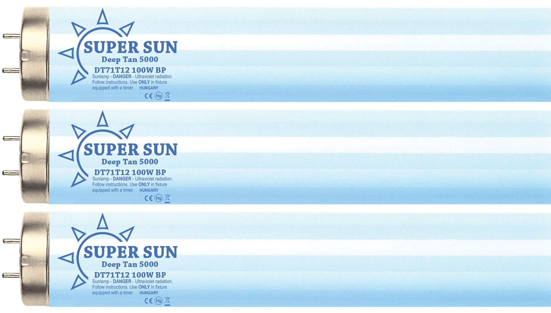 The Super Sun Series lamps are developed with some of the finest natural earth phosphors in the world, for a natural dark bronze tan that lasts. The Super Sun Deep Tan 5000 F71 is great for most 20 to 30 minute sunbeds. Compatible to many popular sunlamps such as: Crystal Sun, Diamond Sun, Bellarium S, Bellarium Plus, Velocity, Eternal Sun, Dark Tan II, Golden Tan, Goldarium SP, Accelerator, Voltarc F71 5.0, Radiance 5000, Rave 7150, Everglo, Eurosun, LSI Midday Sun, Brilliance 5.0, Sunmaster Pro Bronzer, Philips Performance, Sunfit X 100W and many more...