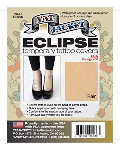 Tatjacket Eclipse Tattoo Covers are the quick and easy way camouflage tattoos on the hands, neck, wrists, ankles, feet, or anywhere you want to temporarily hide an exposed tattoo, blemish, birthmark or other skin discoloration. They are like a flesh colored tattoo for your tattoo. These are a great alternative to tattoo removal, makeup concealer or our tattoo cover sleeves. Best for small tattoos, these covers go on quickly and last for 2 to 3 days. They are flexible and clean looking. They are waterproof, wont smudge or rub off and there is no drying time involved. These are applied similar to a conventional temporary tattoo. But, you get six (6), 4X6 solid color sheets. The sheets can be cut down to conform to the size and shape of your tattoos. Applies in seconds with tap water and lasts for days. Available in 6 different color packs. Or, get the Combination Pack so you can try all 6 colors and find what works best for your skin tone.