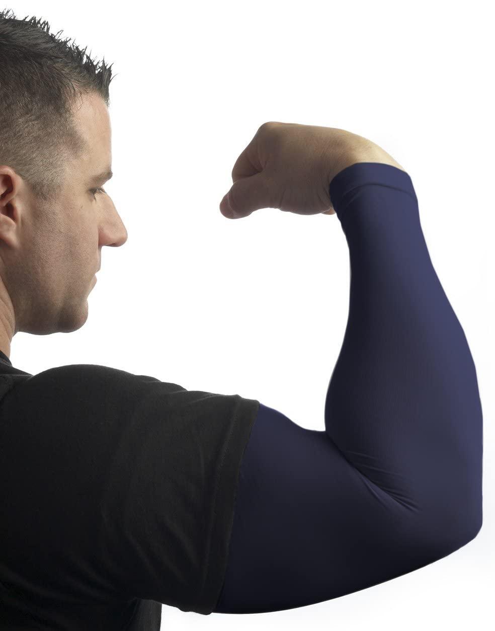 Navy Blue Tatjacket (SMALL) Full Arm tattoo cover-up is cool, lightweight, flexible and breathable. PLEASE SEE SIZING BELOW. TatJacket products not only cover up tattoos, but are also UV Protection Clothing that protects your tattooing from discoloration due to sunlight. Whether you have tattoos or not, Tatjacket tattoo cover up sleeves protects your arms from harmful UV sunlight. The only product that can cover up tattoos and is still designed to be fully functional, cool, and flexible. TATJACKET tattoo cover gives you the ability to wear the most comfortable work clothing for the season without violating company rules. Even without rules prohibiting visible tattoos, TATJACKET tattoo cover up allows you to protect your tattoo's vibrant color and sharp lines from the rays of the sun to help slow fading and discoloration often associated with exposure to the sun. Features include: Package includes 2 Sleeves. Use both or, if you only need one, keep one sleeve clean and available at all times. Smooth and concealed seams for a clean look Fabric blend has a matte finish, not shiny. Non-slip gripper upper cuff so the sleeve stays put. UPF 50 sun protection for your arms. Protects your ink from fading and discoloration. Protects your skin from harmful UV radiation. Size Selection: This applies to men and women alike. These are very general conditions. Height Range 4' to 5' 5" Weight Range 100-110 lbs. Size Small Height Range 4' 10" to 5' 9" Weight Range100-180 lbs. Size Medium Height Range 5' 10" to 6' 5" Weight Range181-280 lbs. Size Large "Because You Love Your Ink But Your Boss Doesn't."