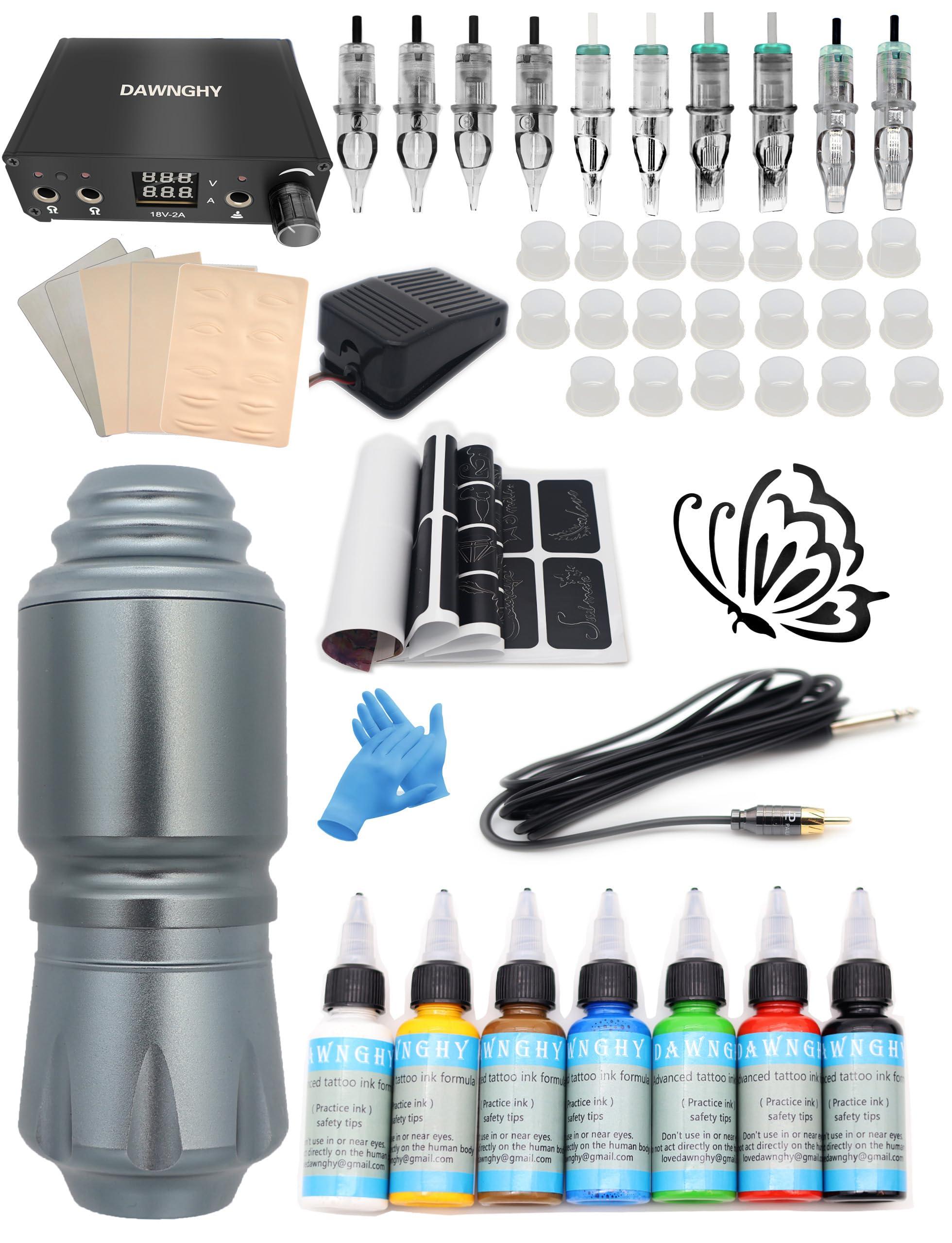 - DAWNGHY Tattoo Set :1 x tattoo pen with RCA wire (aluminum).1 x tattoo power and cable.10 x tattoo needle.1 x Tattoo pinsfoot peda.157 x tattoo pattern.7 x tattoo ink (30 ml).20 x tattoo ink cup.1 x nitrile gloves. 5 x tattoo practice skin