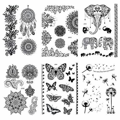 - 6 Pack High-quality single henna tattoo stickers. Each size is about 6 x 8 inches. These include dream catcher, elephant, feather, Mandalay, flower, butterfly, bracelet tattoo, dandelion.