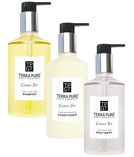 This set includes 3 piece pump bottles. 1 Shampoo, 1 Conditioner & 1 Body Wash. Naturally scented for an invigorating and refreshing scent! Paraben-free, gluten-free & made with organic aloe, honey, green tea leaves & olive oil for soft skin & hair.