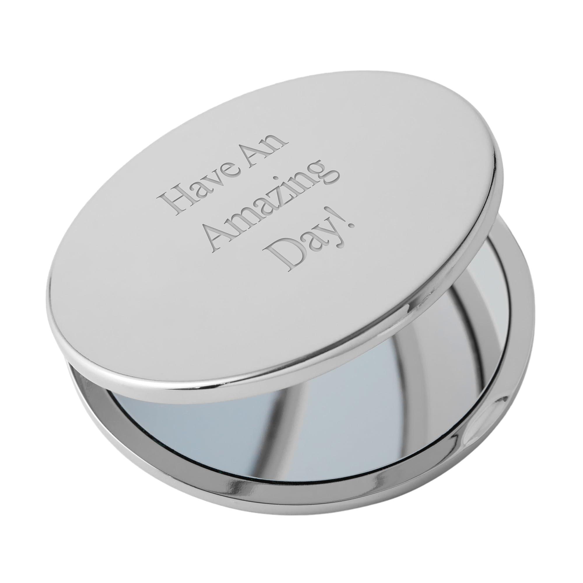 - SUPERIOR QUALITY AND DESIGN Her radiance shines everywhere she goes, especially when she can refresh her look while out and about with this personalized, classic silver-tone compact, complete with a normal and 2x magnifying mirror.