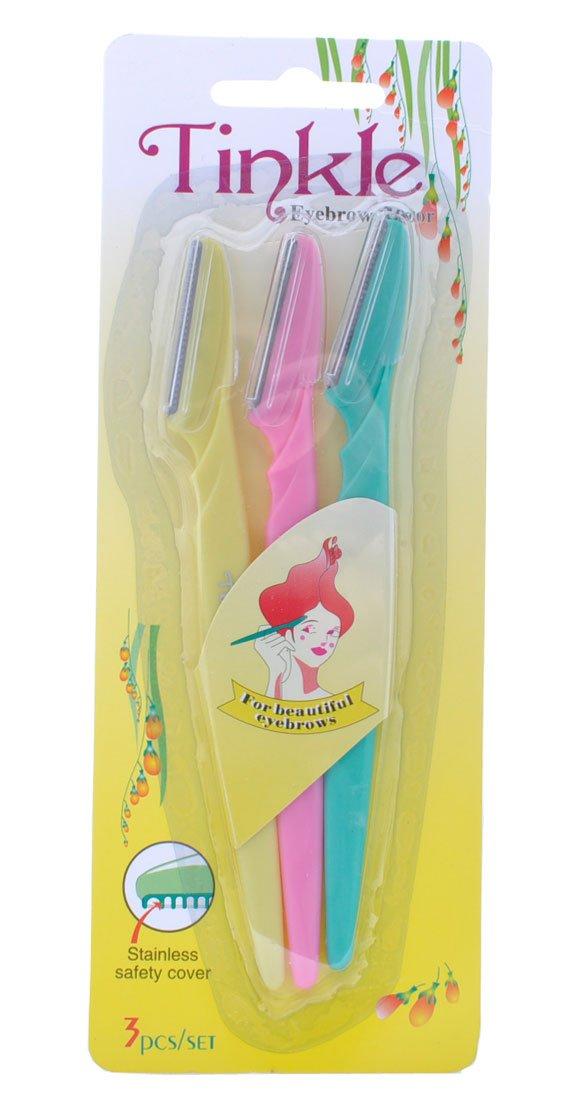 Tinkle Eyebrow Razor removes the fine hairs of the eyebrow, neck and face as well as unnecessary hairs elsewhere. It features a stainless steel safety cover attached to each blade to protect a woman's sensitive skin and prevent blade from cutting too closely while shaving; even beginners can easily and safely use it.
